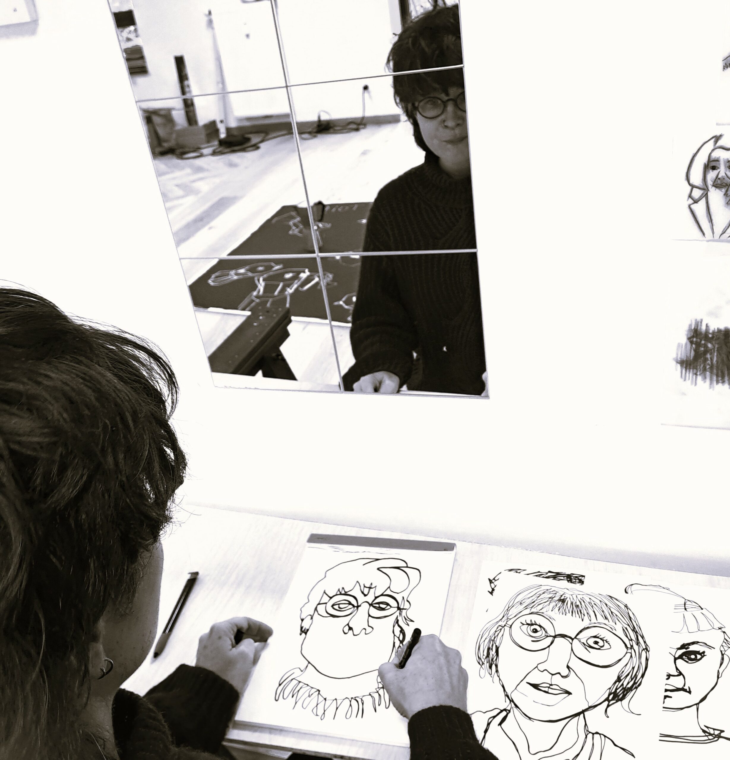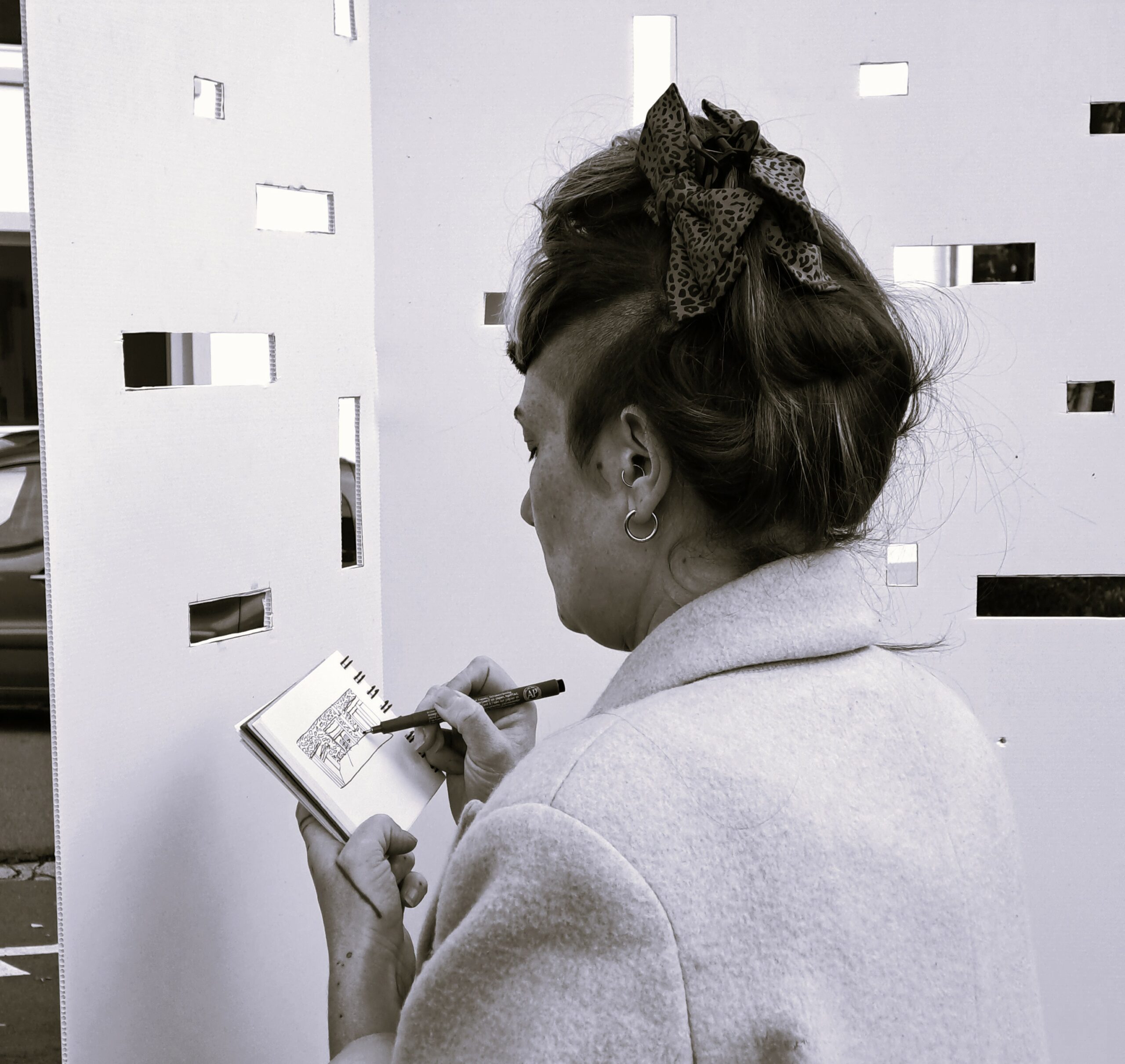 Une équipe de trois dessinatrices vient sur votre événement. La sensibilité et l’expérience de chacune permet de pressentir les accompagnements adéquats auprès des Publics : laisser faire, jouer, conseiller, accompagner ou mettre au défi. Elles accueillent toutes et tous dans un soucis de dépasser les « Mais, moi, je sais pas dessiner … ». Le Public dessine ou réinterprète un paysage, un arbre, une herbe, un nuage, un visage, une main, etc. D’autres espaces proposeront de l’imaginaire : dessiner un souvenir, chercher la couleur d’un sentiment, d’un éclat de rire, investir une tâche, etc. Le public s’arrête entre 20 et 45 minutes. Beaucoup plus s’il le veut. Techniquement : la scénographie s’implante en ville, en campagne, à la montagne, dans un parc ou un rond point. Un mix végétation/habitat semble le plus intéressant. Tout est posé sur le sol et lesté par notre Compagnie. Seul un accès à l’eau est demandé. Notre camionnette rouge reste sur le site car nous y laissons nos réserves de papiers et cartons en cas de temps fragile. De petits espaces d’ombrage (tipis, parasols, …) sont inclus dans l’installation. Le temps de prestation est de 4h (il peut être allongé jusqu’à 8h en doublant l’équipe). Prévoir 1h30/2h00 de montage et 1h30 de démontage. Nous proposons cette respiration au cœur des festivals de rue ou des événements. La scénographie et la création pédagogique sont en construction. Une équipe de six dessinatrices (en tournante) vient d’être formée et nous testons actuellement ce qui permettra la rencontre, la mise au défi douce et légère. Nous créons des pirouettes pour amener au dessin et à la composition graphique sans en avoir l’air. Nous cherchons à mettre les mains des Publics en mouvement pour que le corps dépasse l’esprit.